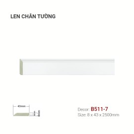 Len Tường Nhựa B511-7 Len tường nhựa B511-7 cấu tạo bởi nhựa composite, được sản xuất trên dây chuyền công nghệ của Hàn Quốc là phụ kiện thiết yếu dùng để che khoảng hở giữa sàn gỗ và chân tường. Đặc biệt: sử dụng được trong nhà và ngoài trời, không cần sơn..